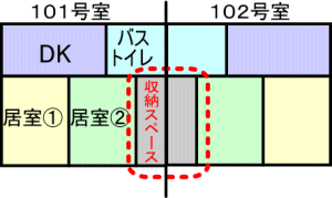 少し考えて作られている物件は、なるべく居室同士が直接面さない構造になっている。図のようなものを反転間取りといい、収納スペースが隣あって緩衝地帯を作るのだが、収納スペースは布団や衣類が入ることが多く、ほとんどの場合、これが防音効果を発揮するのだ。